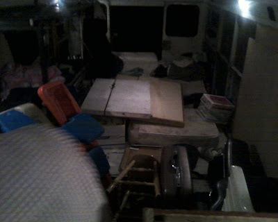 The rear of the bus is like a bouncing diving board when we drive, so we have to batten down the hatches. The broomstick bookend approach was not deemed sea-worthy, so we later stacked our mattresses horizontally.